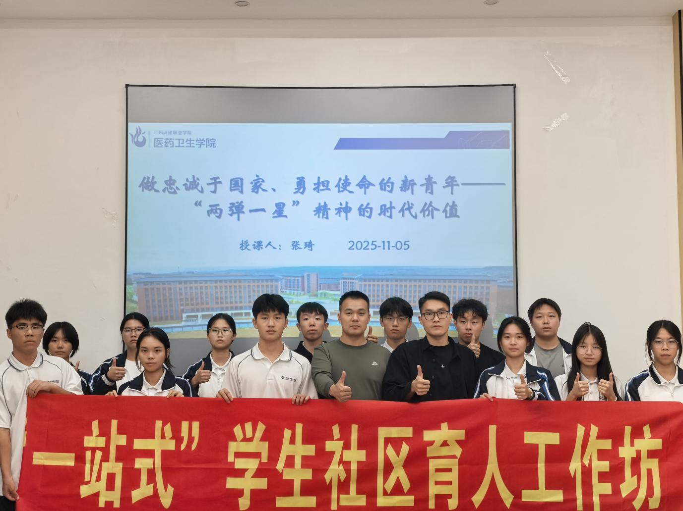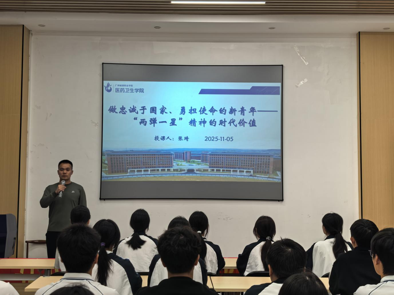 11月15日晚,医药卫生学院在2号学生公寓“一站式”学生社区110功能室举办育人工作坊。本次活动以”做忠诚于国家、勇担使命的新青年“为主题,由学院辅导员、国防教育教导大队指导老师张琦主讲,为40余名医卫学子带来一场生动的大思政课,让”两弹一星“精神与职业理想深度共鸣。