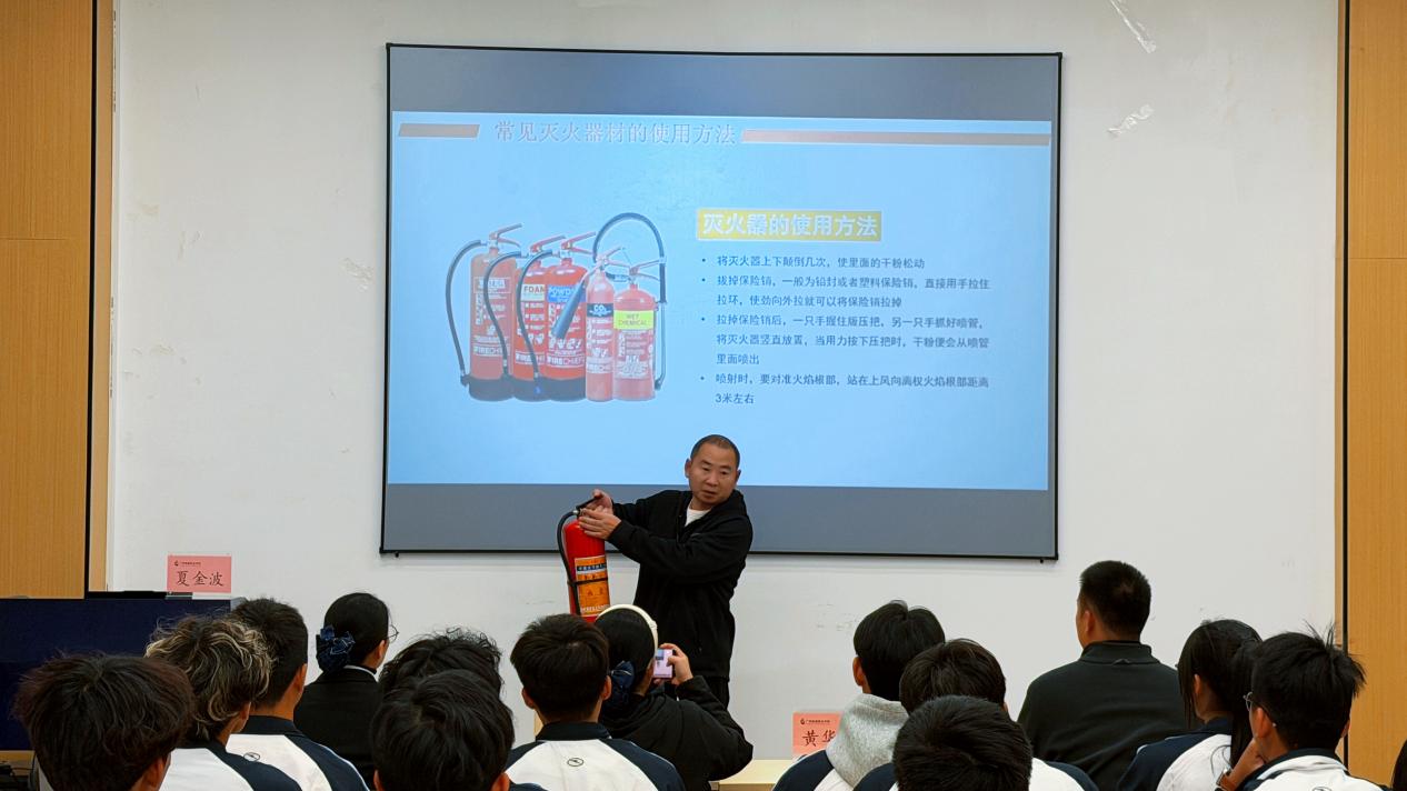 针对学生社区人员密集、场景特殊的特点,夏老师重点聚焦学生宿舍这一高频活动区域,详细讲解了火灾初期的扑救原则、不同类型火情的应对方法,以及火场逃生的关键技巧。他强调,必须坚决杜绝私拉乱接电线、使用大功率电器等危险行为,严禁在宿舍内存放酒精、打火机等易燃易爆物品,切实从源头消除安全隐患。培训中,夏老师还现场展示了灭火器,并逐步演示“提、拔、握、压”的标准操作流程,详细讲解喷射角度、安全距离等关键细节,确保每位学生都能清晰理解、熟练掌握。