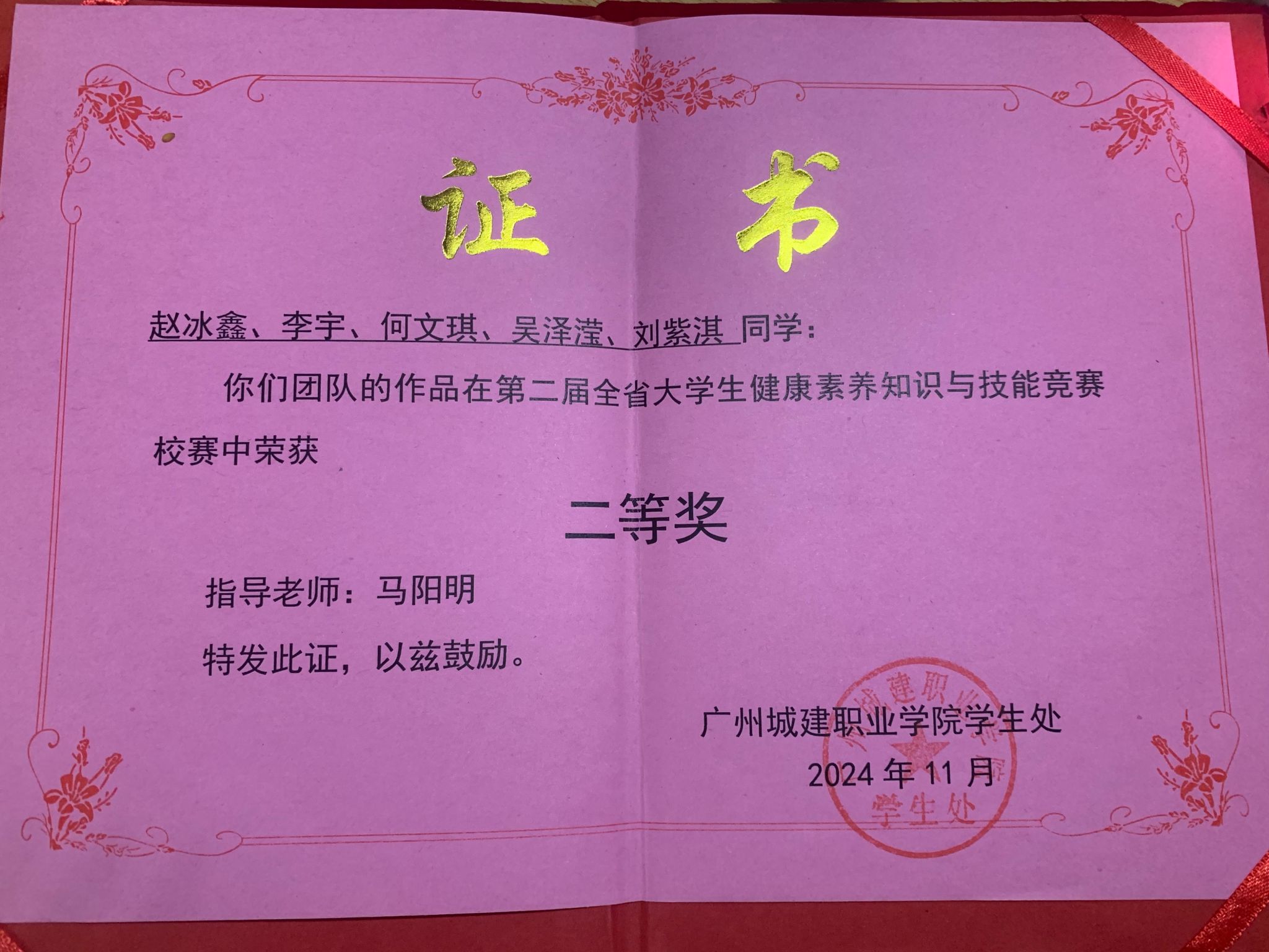 1.第二届全省大学生健康素养知识与技能竞赛校级二等奖