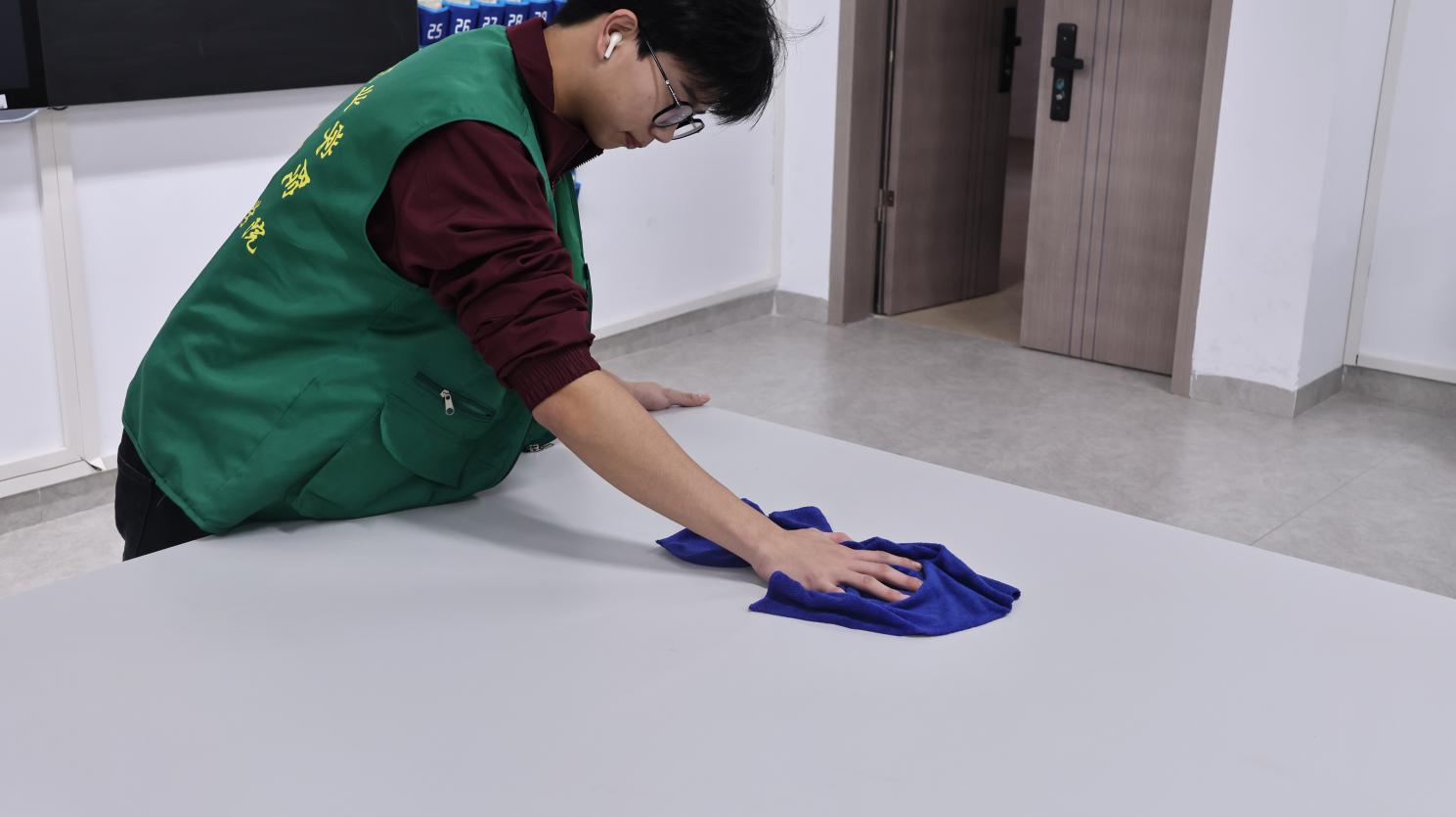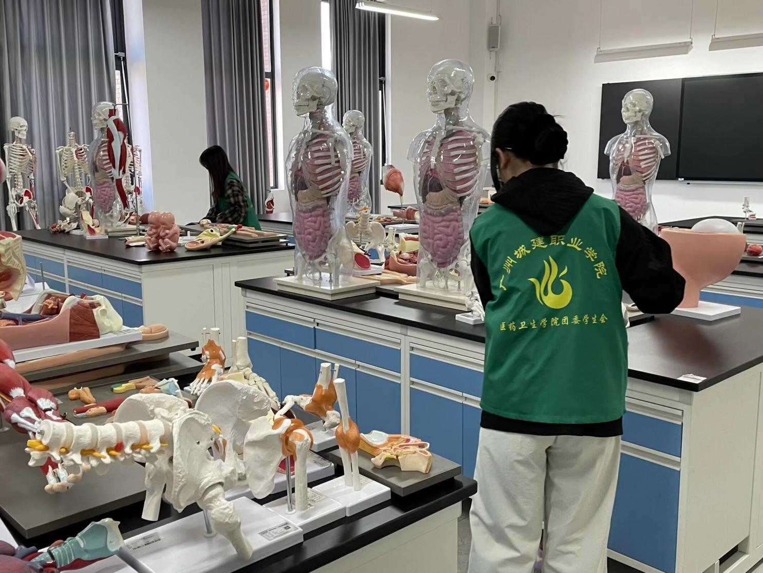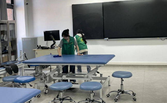 活动现场,志愿者们身穿统一绿马甲,在学生干部的统筹安排下,分工明确、配合默契。结合我院医药卫生类实训室的专业特点,志愿者们重点对实验操作台、仪器设备等进行了全面清洁,按照规范要求整理实验器材与药品耗材,并对地面、门窗、墙角等卫生死角进行了彻底清扫,充分展现了我院学子严谨细致的专业素养和积极向上的精神风貌。