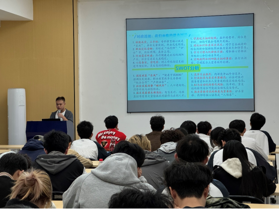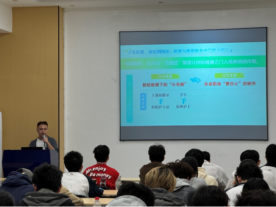 谈及职业规划这一核心议题,陈泽鹏老师将思政引领与生涯指导紧密结合,以“个人发展融入国家战略”为核心逻辑,为同学们搭建清晰的成长框架。他运用SWOT分析法,客观剖析医药行业就业形势,结合“健康中国2030”规划纲要中“加强基层医疗卫生人才队伍建设”“健全技能人才培养体系”等政策导向,深入解读医药专科生在社区医疗、公共卫生、养老护理等领域的发展机遇,让同学们明确“个人职业选择要与国家健康事业需求同频共振”。在此基础上,他提出“诊断-处方-疗程”式生涯规划三步走:“诊断”自身职业素养短板,“处方”个性化技能提升方案,“疗程”长效践行成长计划。同时,他将纪律教育作为思政教育的重要内容,以“医护人员的纪律红线就是患者的生命防线”为核心观点,通过医疗行业违纪案例警示,强调“守时、诚信、严谨”是医药从业者的“职业生命线”,提醒同学们严守职业规范,守护好“人生与职业的双重入场券”,将个人成长牢牢锚定“健康守门人”的责任坐标。