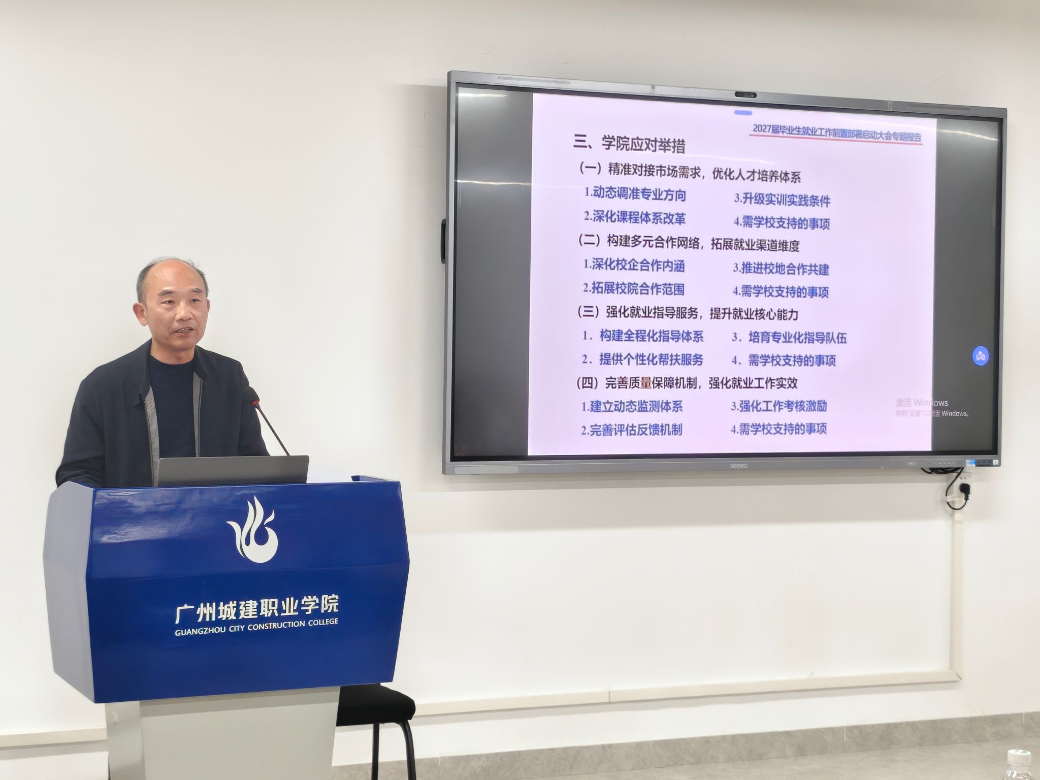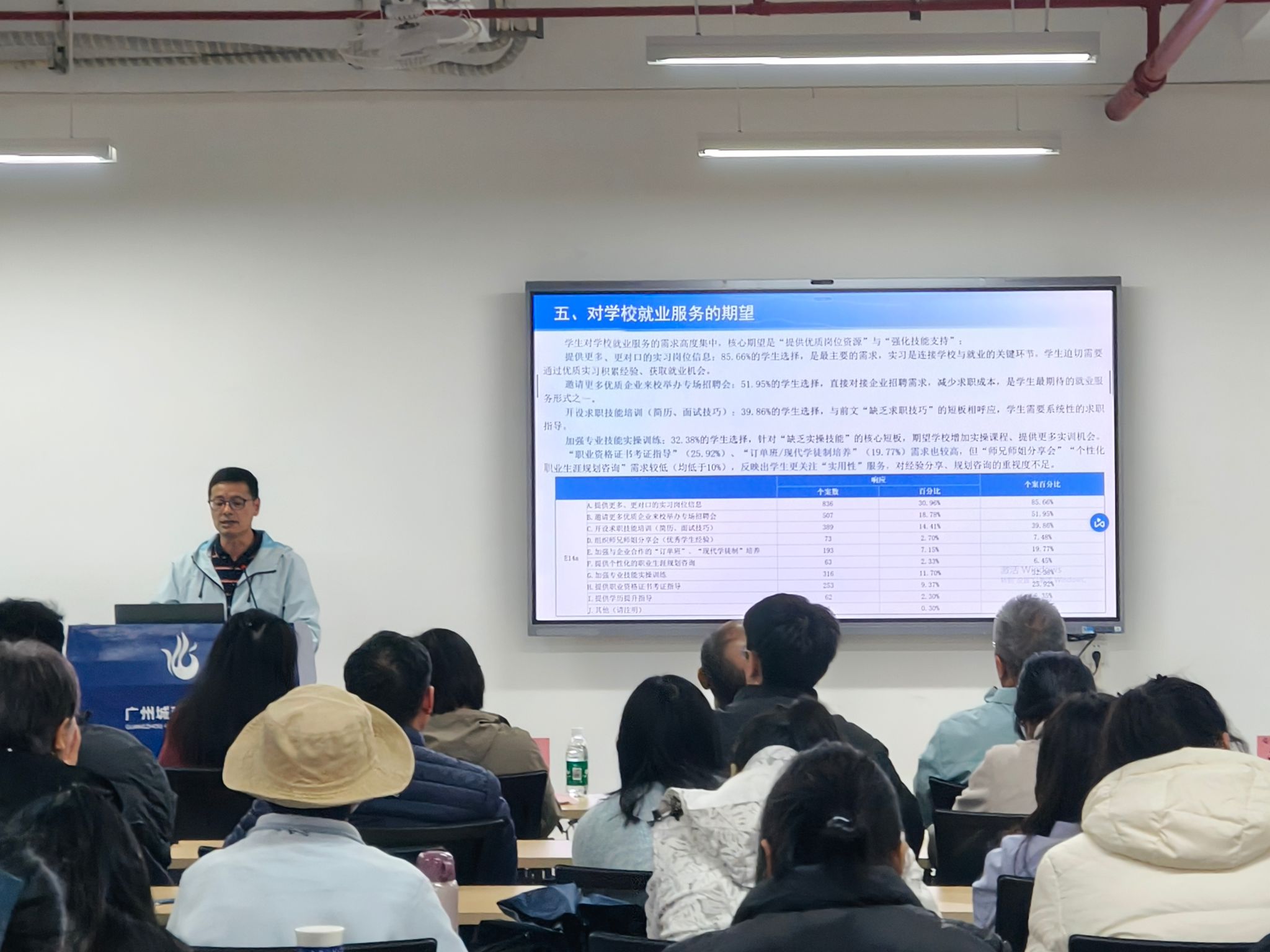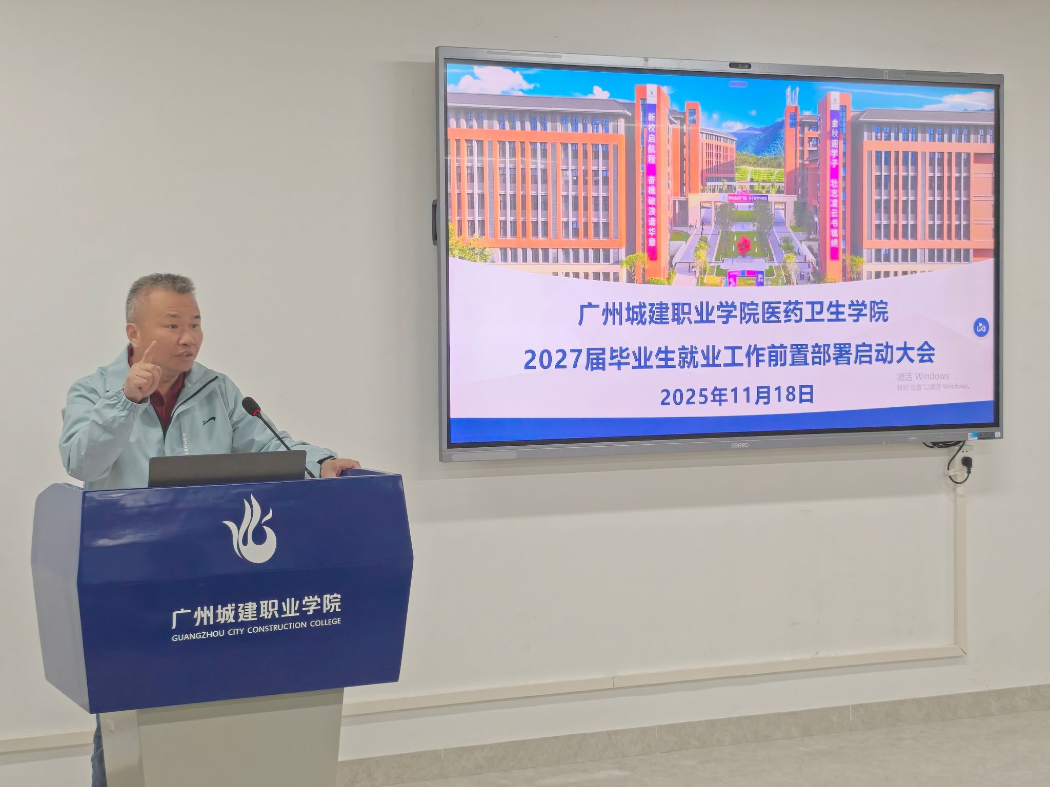 会上,就业创业处处长潘福中全面解读《广州城建职业学院医药卫生学院2027届毕业生毕业去向调查报告》,从毕业去向倾向、就业意向期望、就业准备与心态、升学规划与心态、对学校就业服务期望等层面系统分析医药卫生学院2027届毕业生的就业选择及就业服务需求。他针对学生就业倾向、就业焦虑、就业准备等问题,提出五项关键对策:一是强化毕业去向引导,精准匹配学生发展需求;二是聚焦核心能力提升,增强学生就业竞争力;三是深化就业心态疏导,帮助学生建立理性求职观念;四是完善升学支持体系,满足学生学历提升需求;五是整合校内外资源,提升就业服务质量。
